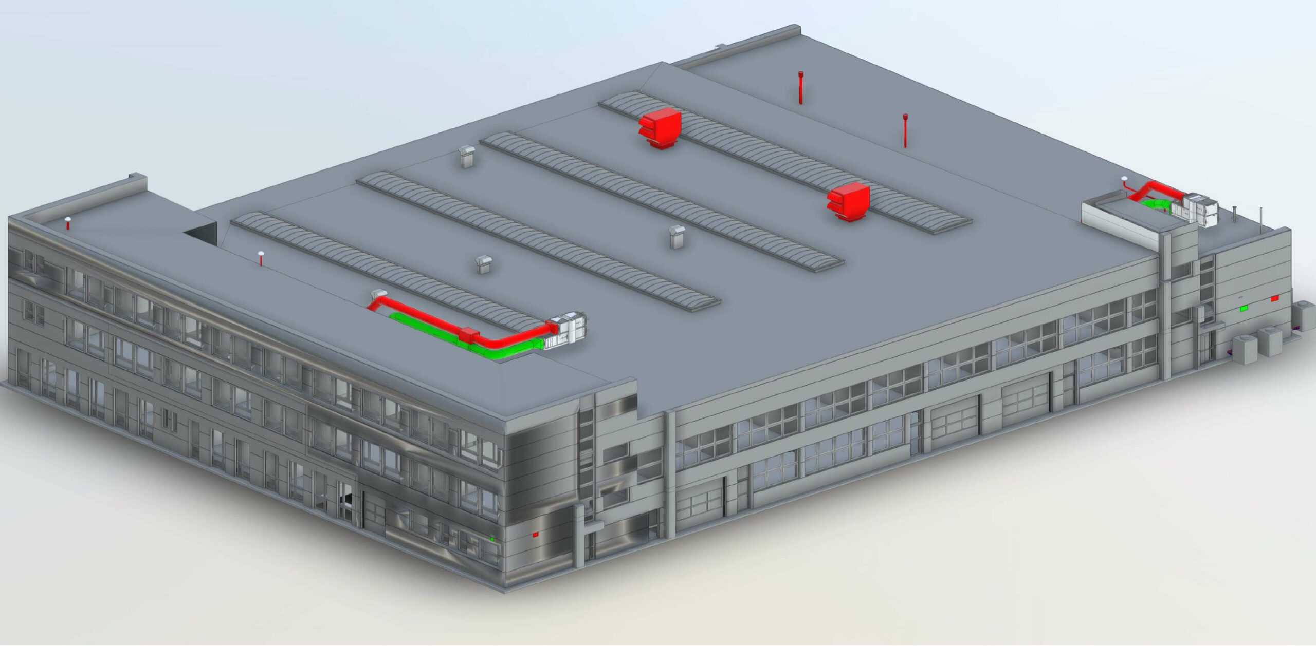 Na etapie projektowania powstał wyłącznie model instalacji sanitarnych, a następnie w celu usprawnienia procesu budowy, dzięki korzyściom płynącym z modelu, dział projektowy inwestora (specjalizacja automatyka przemysłowa) na etapie realizacji zamodelował branże architektury i konstrukcji w programie Sketchup. Na szczególną uwagę zasługuje instalacja ogrzewania i chłodzenia obiektu. Źródłem ciepła i chłodu jest maszynownia hybrydowa składająca się z kotła gazowego, powietrznych pomp ciepła i agregatu wody lodowej z dodatkowym odzyskiem ciepła z wtryskarek.