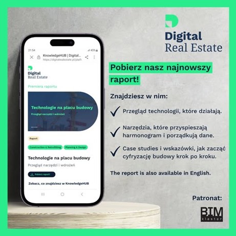 Z przyjemnością informujemy, że BIM Klaster objął patronatem raport „Digital Real Estate: Technologie na placu budowy” – niezależny przegląd technologii, które realnie wspierają procesy inwestycyjne.