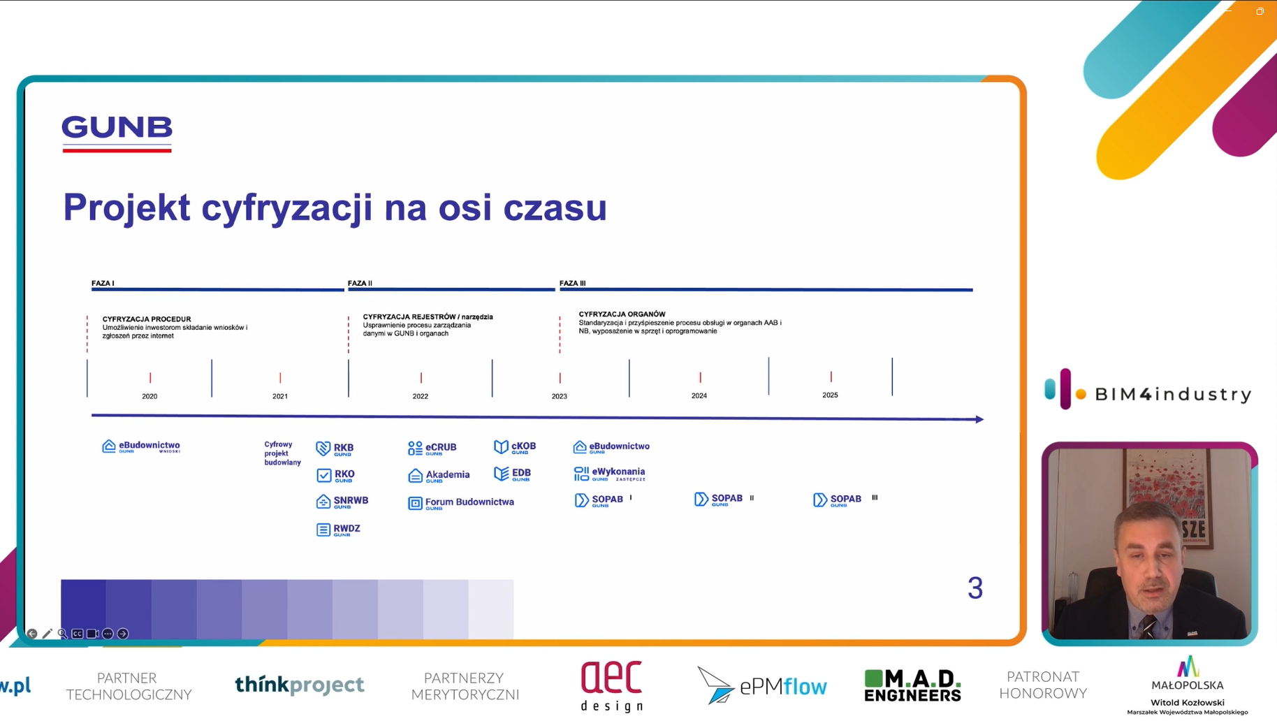 Tegoroczną edycję wydarzenia rozpoczęły wystąpienia przedstawicieli Głównego Urzędu Nadzoru Budowlanego, Grzegorza Polaka i Jarosława Sosnowskiego, którzy podczas swoich prezentacji omówili działania związane z cyfryzacją procesu budowlanego zrealizowane i realizowane przez Główny Urząd Nadzoru Budowlanego oraz dotychczasowe miejsce GINB jako przewodniczącej grupy ds. BIM przy Ministrze Rozwoju i Technologii. Blok pierwszy zakończyła prezentacja Daniela Kesslera z Krakowskiego Parku Technologicznego i Katarzyny Orlińskiej-Dejer (BIM Klaster), którzy omówili rolę hub4industry EDIH i formy wsparcia dla MŚP  w procesie ewolucji do firm przyszłości. Szczególne miejsce poświecono prezentacji usług nakierowanych na popularyzację metodyki BIM i podnoszenie kompetencji firm w tym zakresie, takich jak: szkolenia, wdrożenia, demonstracje, konferencje, podręczniki dobrych praktyk.