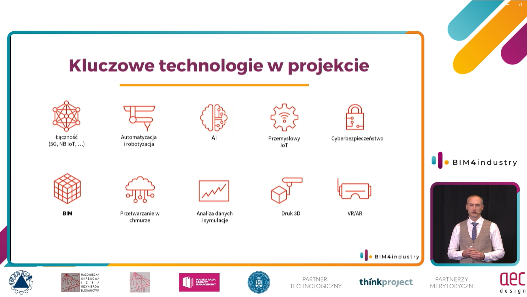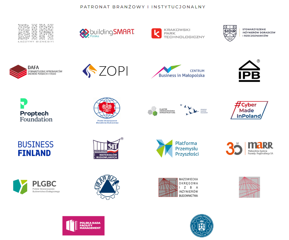 Konferencja wspierają również: Krakowski Park Technologiczny, Platforma Przemysłu Przyszłości, Małopolska Agencja Rozwoju Regionalnego (MARR), Business Finland, Centrum Business in Małopolska, Izba Projektowania Budowlanego, Polskie Stowarzyszenie Menedżerów Budownictwa, Stowarzyszenie Inżynierów Doradców i Rzeczoznawców (SIDiR), Związek Ogólnopolski Projektantów i Inżynierów (ZOPI), Klaster Zrównoważona Infrastruktura, Proptech Foundation, buildingSMART Polska, Polskie Stowarzyszenie Budownictwa Ekologicznego PLGBC, Stowarzyszenie BIM, klaster CyberMadeINPoland, Mazowiecka Okręgowa Izba Inżynierów Budownictwa, Małopolska Okręgowa Izba Inżynierów Budownictwa, Polska Rada Facility Management (PRFM), Stowarzyszenie Wykonawców Dachów Płaskich i Fasad, Politechnika Poznańska oraz Stowarzyszenie Inżynierów i Techników Przemysłu Materiałów Budowlanych