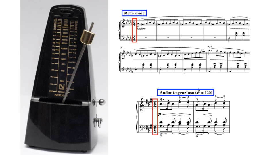 Na niebiesko oznaczone jest tempo, czyli ile wynosi wartość BPM (beats per minute – uderzeń na minutę) w zakresie 40-208 dla nuty, będącej definicją taktu (pierwszy rysunek – ćwierćnuta, drugi – ósemka). Pierwsze tempo to na skali taktomierza ok. 170 BPM dla ćwierćnuty (Molto Vivace – szybkie tempo), drugie to zapisane 120 BPM dla ósemki, czyli długość trwania ósemki jest tutaj pół sekundy (120 ósemek na minutę – dość wolne tempo).