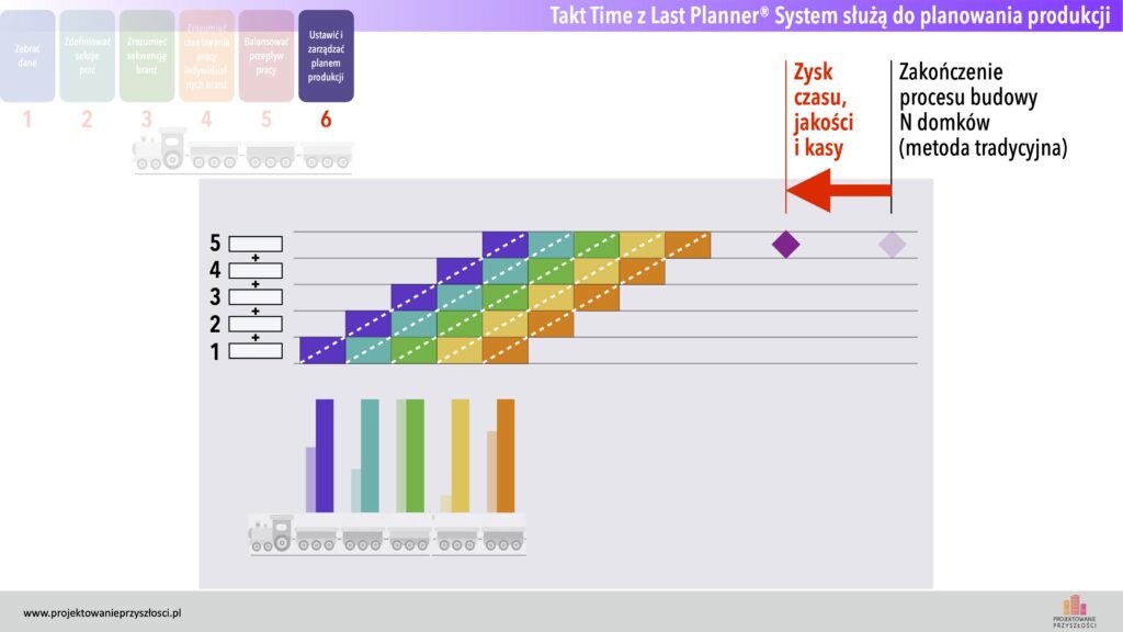 Po ustaleniu ostatecznego czasu taktu, najszybsze branże mogą z kolei odwołać któregoś z pracowników na inną budowę, gdyż będą miały rezerwę czasową na naszej inwestycji. Rezultatem zbalansowanego czasu trwania taktu jest płynny przejazd naszego pociągu przez wszystkie stacje procesu z jedną prędkością.