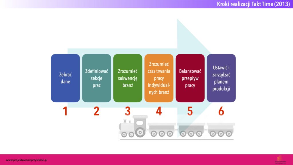 Takt Time wymaga kilku standardowych kroków, które sprawdzają się w każdym typie inwestycji, czy to kubaturowej, czy infrastrukturalnej. Ich zestawienie i sekwencję ilustruje poniższa grafika.