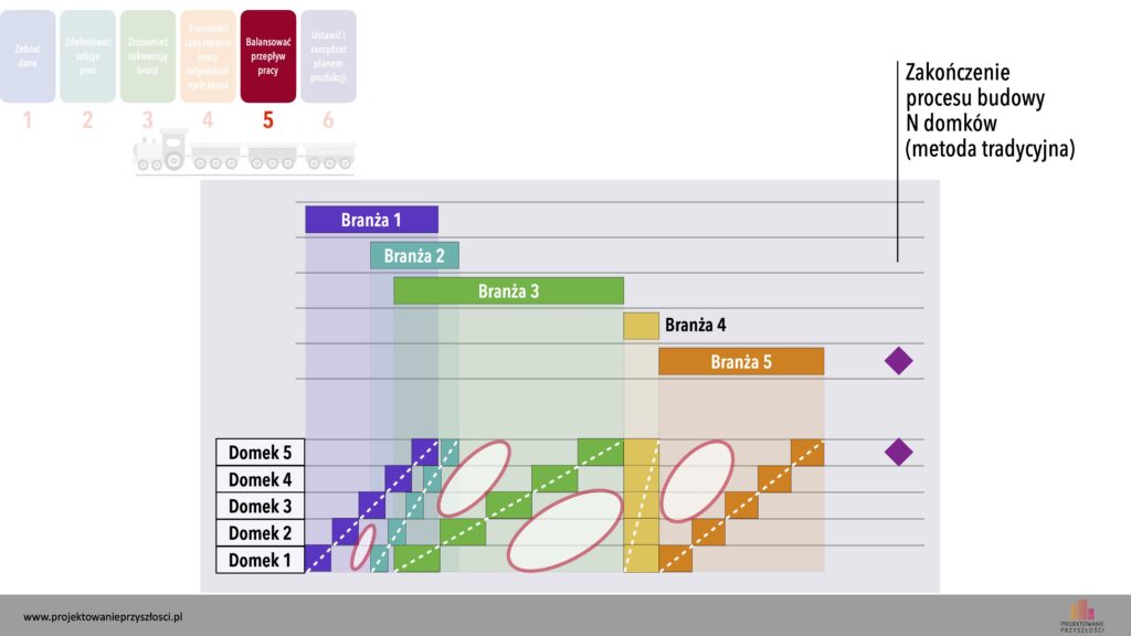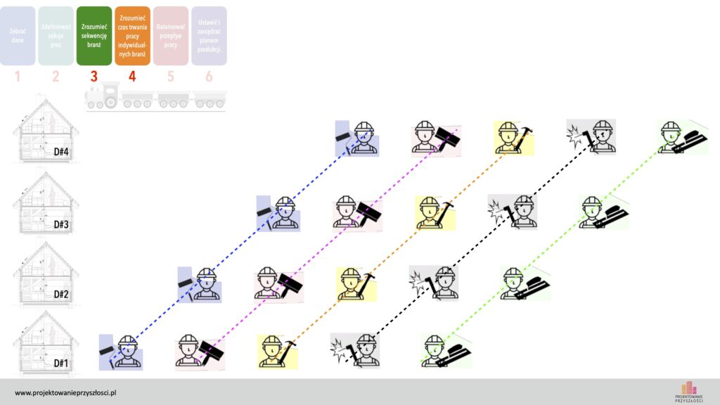 Wygląda to tak, że każda branża, po ukończeniu jednego domku, płynnie przenosi się do kolejnego, a za nią wchodzi do poprzedniego domku branża następna. Tym samym uzyskujemy taki sam czas prac dla jednego domku, zatem ustalony jednakowy czas dla każdego taktu jest zachowany.