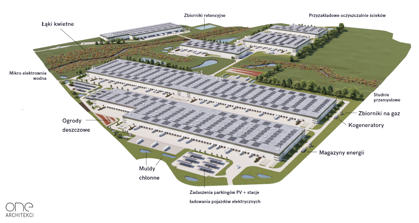 Poniżej przedstawiona aksonometria projektowanego parku logistycznego ilustruje wdrożone technologie. Niektóre z instalacji stanowią infrastrukturę podziemną i zostały symbolicznie opisane tekstowo.