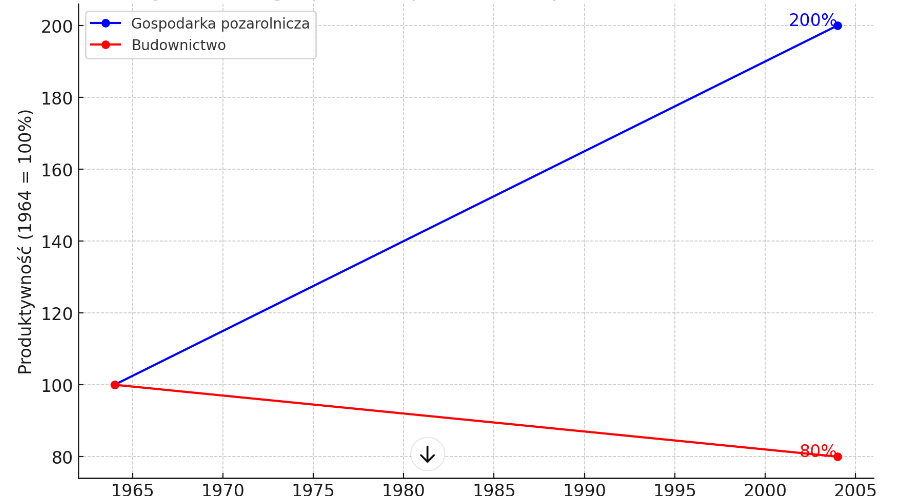 Według badań przeprowadzonych w USA produktywność w gospodarce pozarolniczej w latach 1964-2004 wzrosła ponad 100%, a w budownictwie zmalała o 20%. Jak widać zbiór spełnionych do tej pory warunków koniecznych nie jest kompletny.